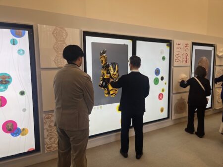 さらに、モニター間には、3D印刷やUV印刷で献納宝物のディテールをあらわした壁面レリーフがあり、触れるコンテンツになっています。ここで壁面レリーフのモチーフとしてとりあげた文化財は、すべて東京国立博物館蔵。受け継がれてきた宝物の美しい文様やかたちを、手による知覚を通して鑑賞できます。